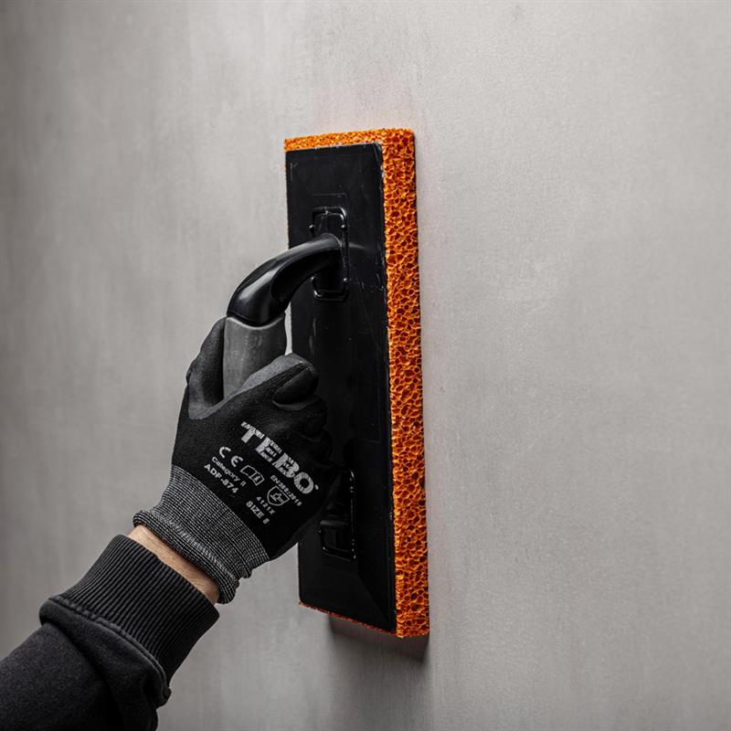 A plastering trowel, float for plastering, foam trowel or sponge plastering float is used to smooth and texture plastered surfaces of e.g. concrete for creating a fine or rough texture.